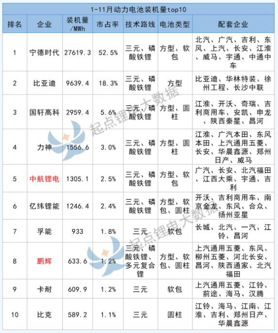 GGII统计数据显示,1-11月新能源汽车合计生产约102.3万辆,同比增长3%;装机电量约52.67GWh,同比增长21%。根据起点研究院数据,前11个月动力电池装机量排名如下:
