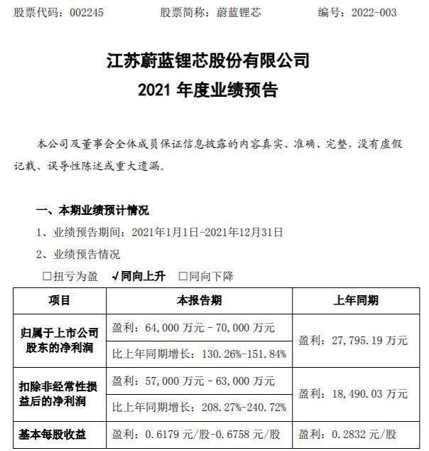 挖贝网1月24日,蔚蓝锂芯(002245)近日发布2021年度业绩预告,预计业绩同向上升。报告期内归属于上市公司股东的净利润64,000万元-70,000万元,比上年同期增长130.26%-151.84%;基本每股收益0.6179元/股-0.6758元/股。