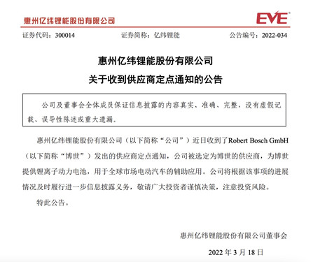 公告称,公司近日收到了Robert Bosch GmbH (以下简称“博世”)发出的供应商定点通知,公司被选定为博世的供应商,为博世提供锂离子动力电池,用于全球市场电动汽车的辅助应用。