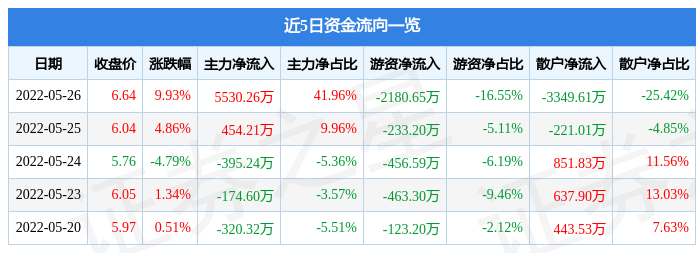 资金流向数据方面,5月26日主力资金净流入5530.26万元,游资资金净流出2180.65万元,散户资金净流出3349.61万元。