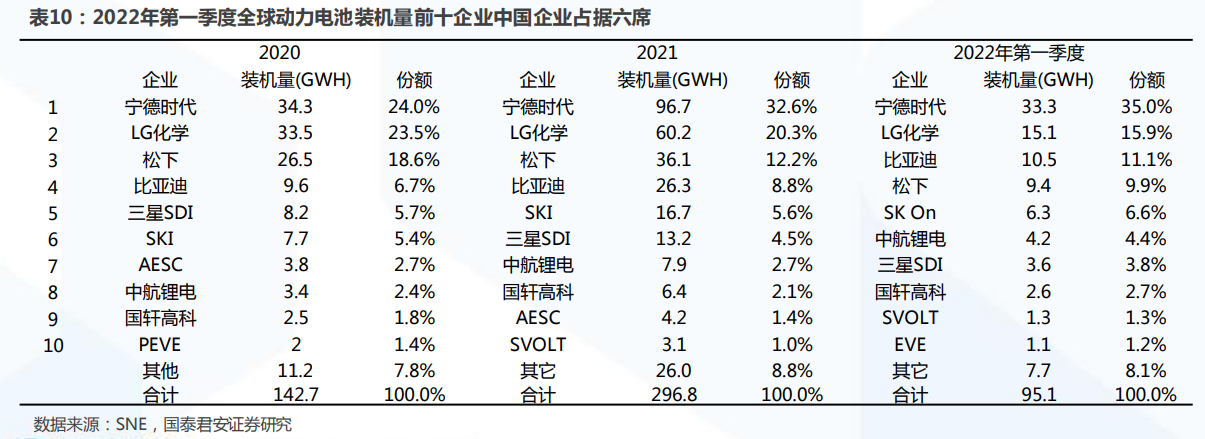 宁德时代连续多年占据全球动力电池出货量榜首位置,2021年受益于海外客户的放量全球市占率达到32.6%;2022年,第一季度全球市占率达到35.0%,进一步拉开与后面企业的差距。总体来看,全球头部动力电池企业以中日韩为主,体现出三国在锂电池领域强有力的市场地位。其中,前十中我国动力电池企业独占六席,且份额逐步提升,竞争能力进一步增强。