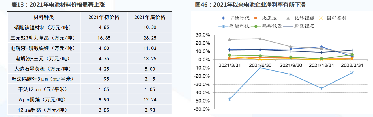 受到原材料价格上涨影响,动力电池成本显著上涨。2021年以来新能源汽车下游需求持续向好,电池材料需求显著上升,部分环节供需结构严重错配,受此影响核心锂电材料价格均有所上涨。具体来看PVDF、六氟磷酸锂、碳酸锂等产品涨幅居前,受此影响正极材料、电解液两大电池直接材料价格大幅上涨。