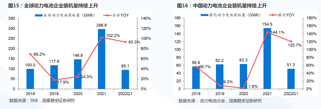 受益于中国和欧洲市场汽车电动化的快速推进,2016年以来全球新能源汽车销量快速上升,动力电池装机量同步提升。2021年全球动力电池装机量达到296.8Gwh,同比增长102%;中国动力(600482)电池装机量达到154.5Gwh,同比增长144%,快于全球平均增速,占全球电池装机量超一半。2022年第一季度全球动力电池装机量95GWh,同比增长93.3%;其中,中国动力电池装机量51GWh,同比增长120.7%。
