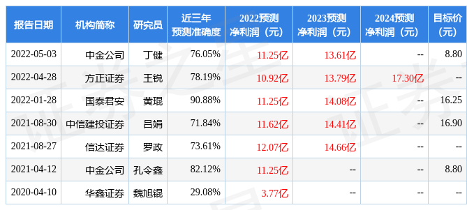 证券之星数据中心根据近三年发布的研报数据计算,国泰君安(601211)黄琨研究员团队对该股研究较为深入,近三年预测准确度均值高达90.88%,其预测2022年度归属净利润为盈利11.25亿,根据现价换算的预测PE为21.08。